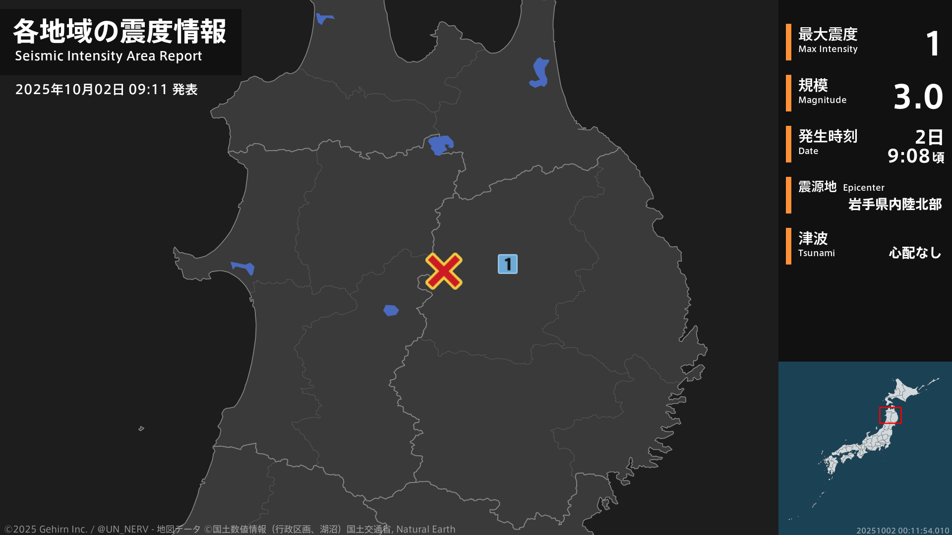 9時8分頃、岩手県内陸北部を震源とする地震がありました。震源の深さは約10km、地震の規模はM3.0、最大震度1を岩手県で観測しています。この地震による津波の心配はありません。