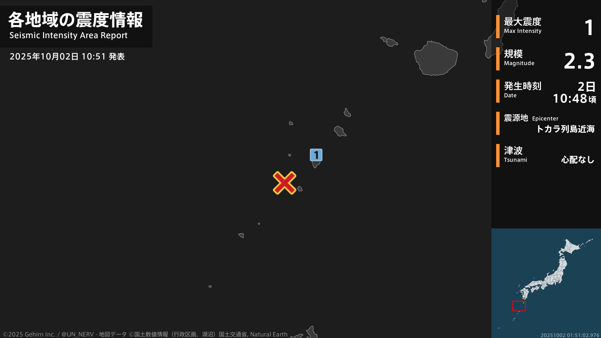 10時48分頃、トカラ列島近海を震源とする地震がありました。震源の深さは約20km、地震の規模はM2.3、最大震度1を鹿児島県で観測しています。この地震による津波の心配はありません。