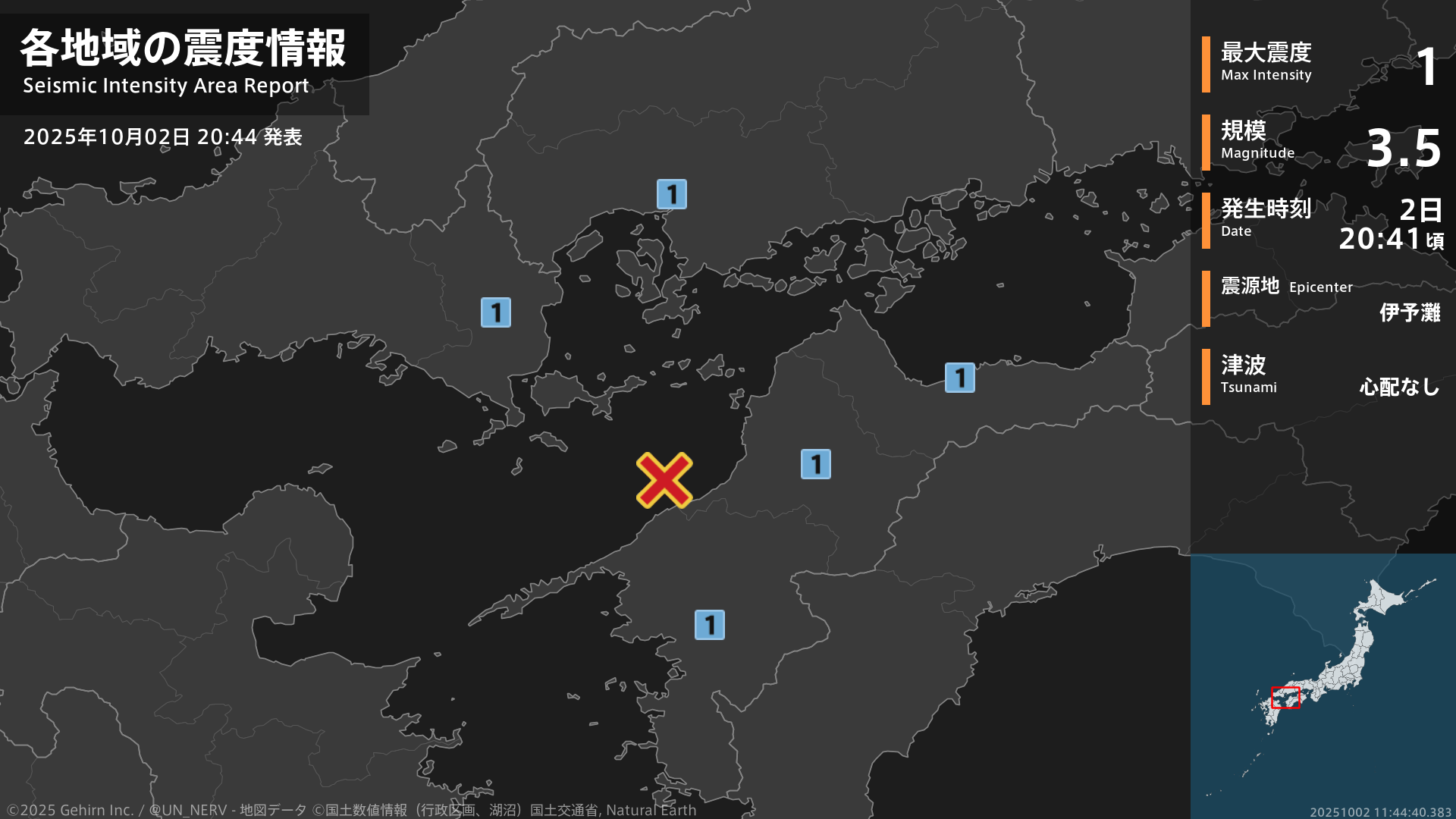 20時41分頃、伊予灘を震源とする地震がありました。震源の深さは約40km、地震の規模はM3.5、最大震度1を広島県、山口県、愛媛県で観測しています。この地震による津波の心配はありません。
