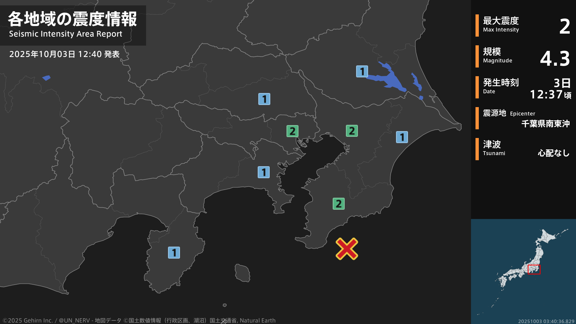 12時37分頃、千葉県南東沖を震源とする地震がありました。震源の深さは約60km、地震の規模はM4.3、最大震度2を千葉県、東京都で観測しています。この地震による津波の心配はありません。