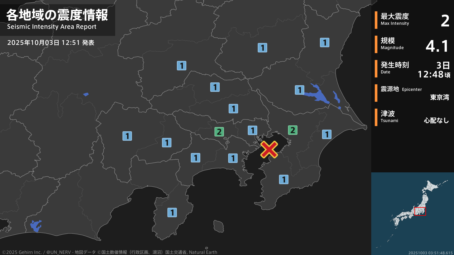 12時48分頃、東京湾を震源とする地震がありました。震源の深さは約110km、地震の規模はM4.1、最大震度2を千葉県、東京都で観測しています。この地震による津波の心配はありません。