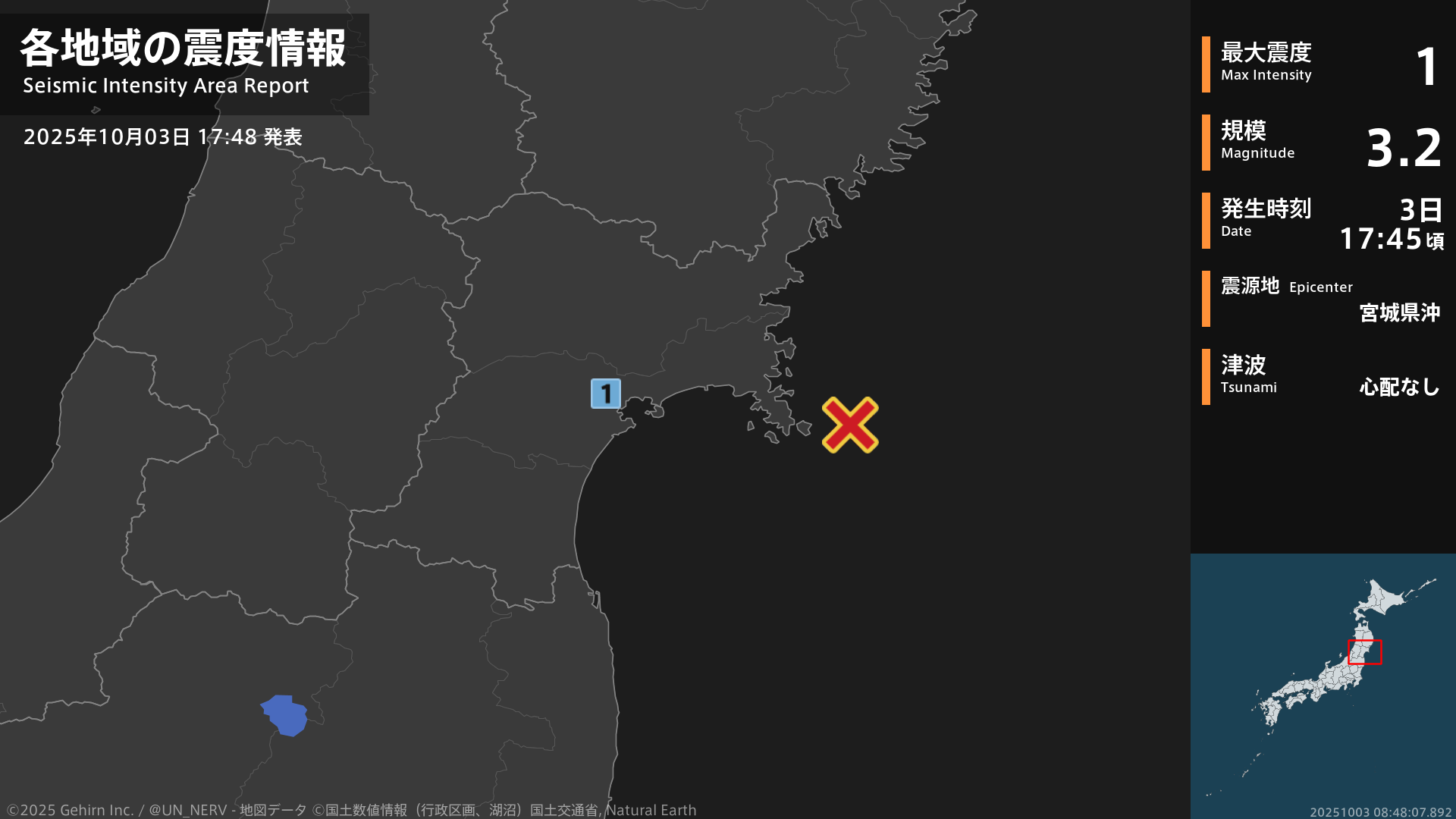 17時45分頃、宮城県沖を震源とする地震がありました。震源の深さは約60km、地震の規模はM3.2、最大震度1を宮城県で観測しています。この地震による津波の心配はありません。