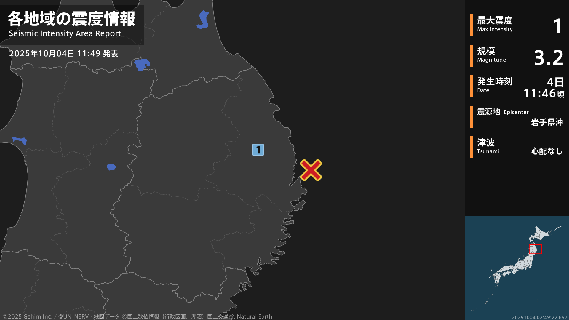 11時46分頃、岩手県沖を震源とする地震がありました。震源の深さは約40km、地震の規模はM3.2、最大震度1を岩手県で観測しています。この地震による津波の心配はありません。