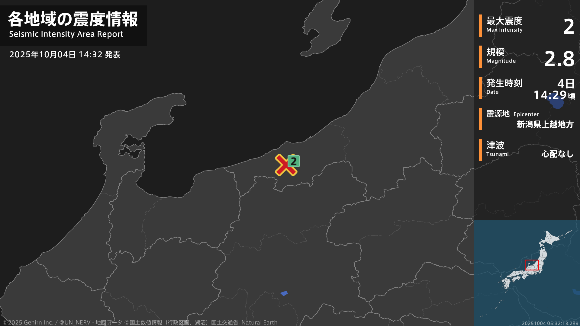 14時29分頃、新潟県上越地方を震源とする地震がありました。震源の深さは約10km、地震の規模はM2.8、最大震度2を新潟県で観測しています。この地震による津波の心配はありません。