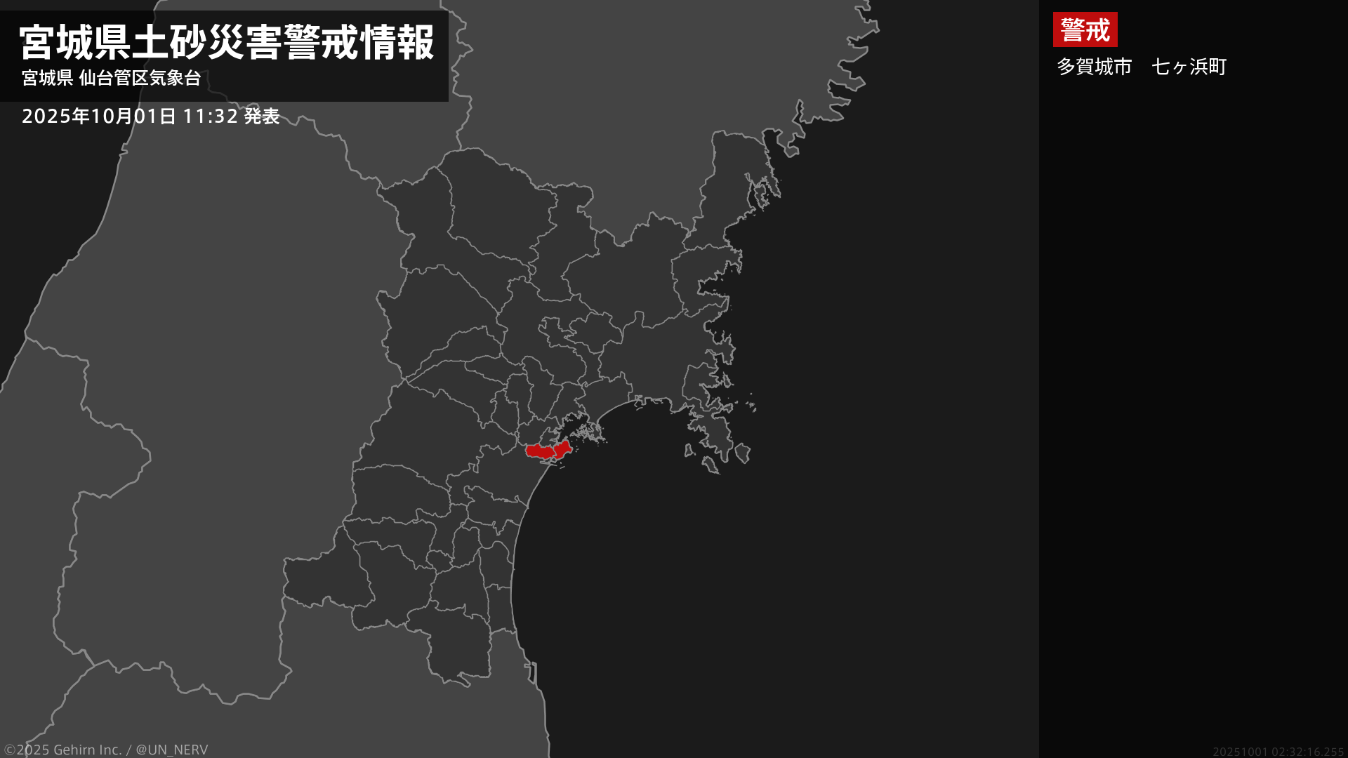 【宮城県 土砂災害警戒情報 2025年10月01日 11:32】宮城県の警戒対象地域では土砂災害の危険度が高まっています。身の安全を確保するよう努めてください。#土砂災害警戒情報 #宮城県