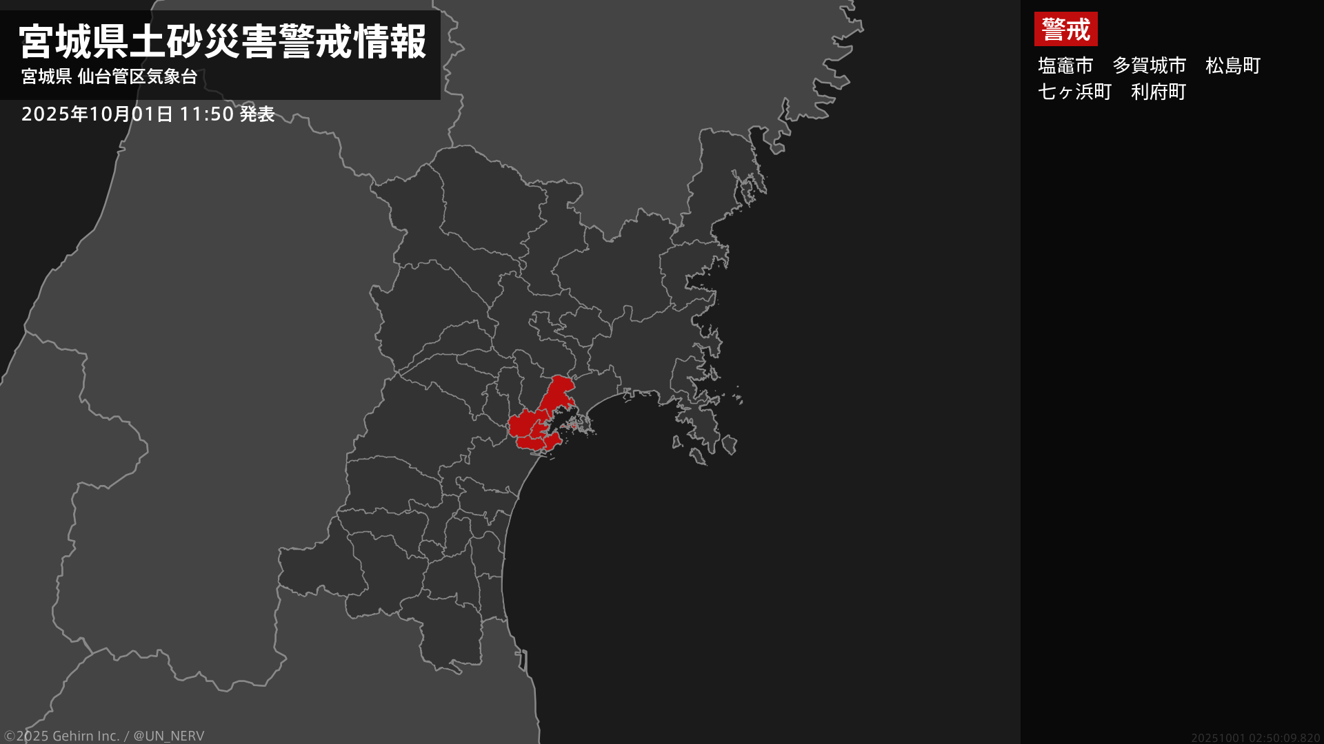 【宮城県 土砂災害警戒情報 2025年10月01日 11:50】宮城県の警戒対象地域では土砂災害の危険度が高まっています。身の安全を確保するよう努めてください。#土砂災害警戒情報 #宮城県