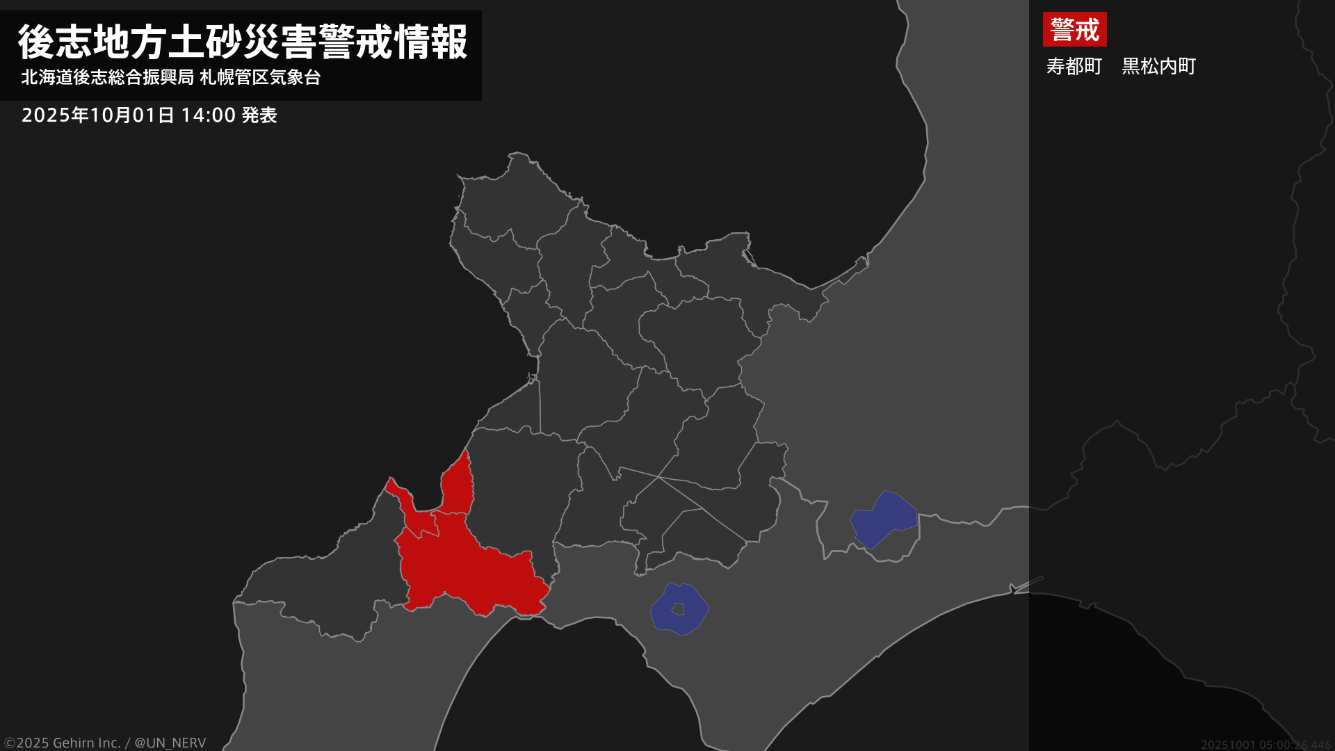 【後志地方 土砂災害警戒情報 2025年10月01日 14:00】後志地方の警戒対象地域では土砂災害の危険度が高まっています。身の安全を確保するよう努めてください。#土砂災害警戒情報 #後志地方