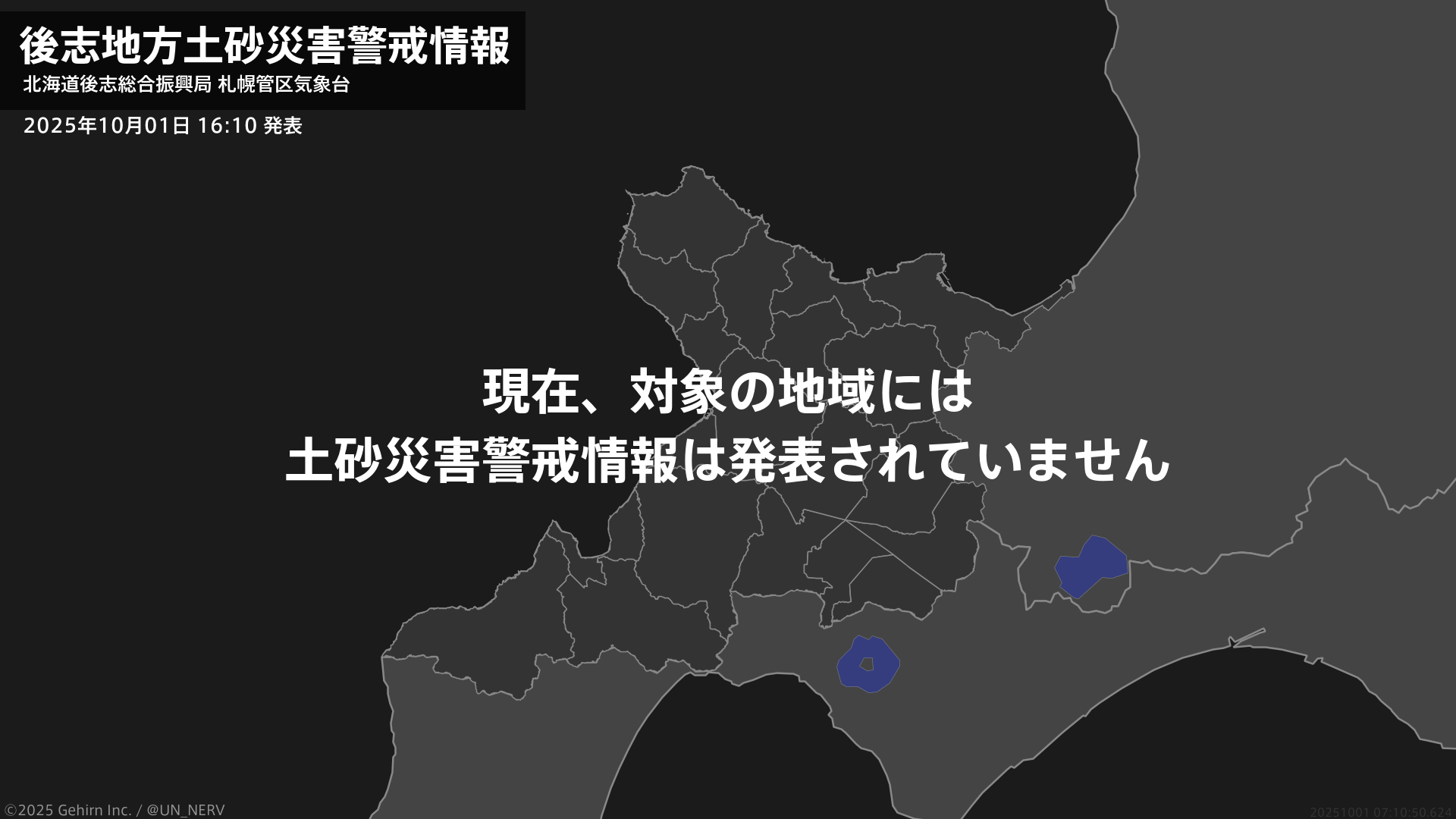 【後志地方 土砂災害警戒情報 2025年10月01日 16:10】後志地方に発表されていた土砂災害警戒情報はすべて解除されました。#土砂災害警戒情報 #後志地方