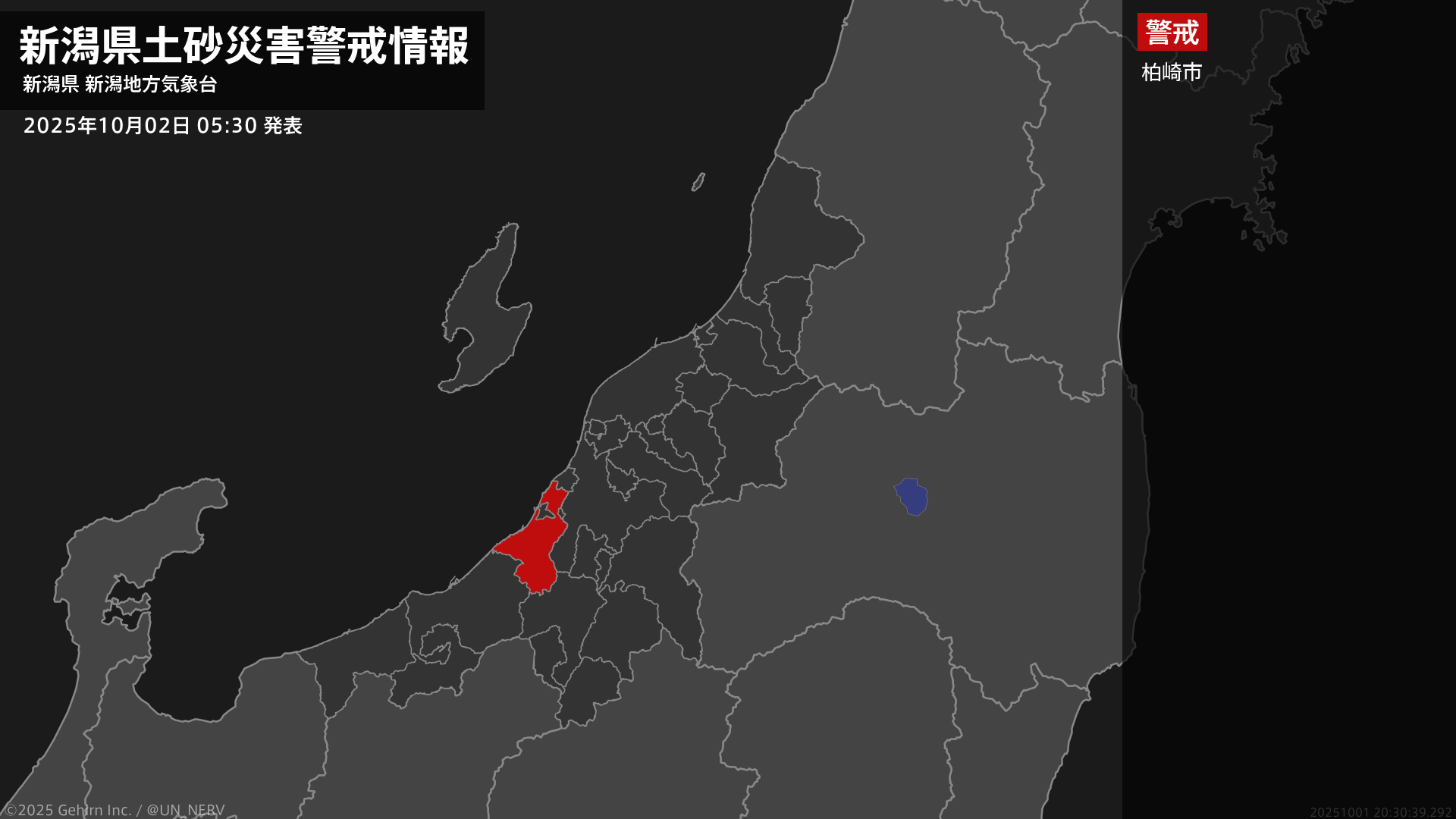 【新潟県 土砂災害警戒情報 2025年10月02日 05:30】新潟県の警戒対象地域では土砂災害の危険度が高まっています。身の安全を確保するよう努めてください。#土砂災害警戒情報 #新潟県