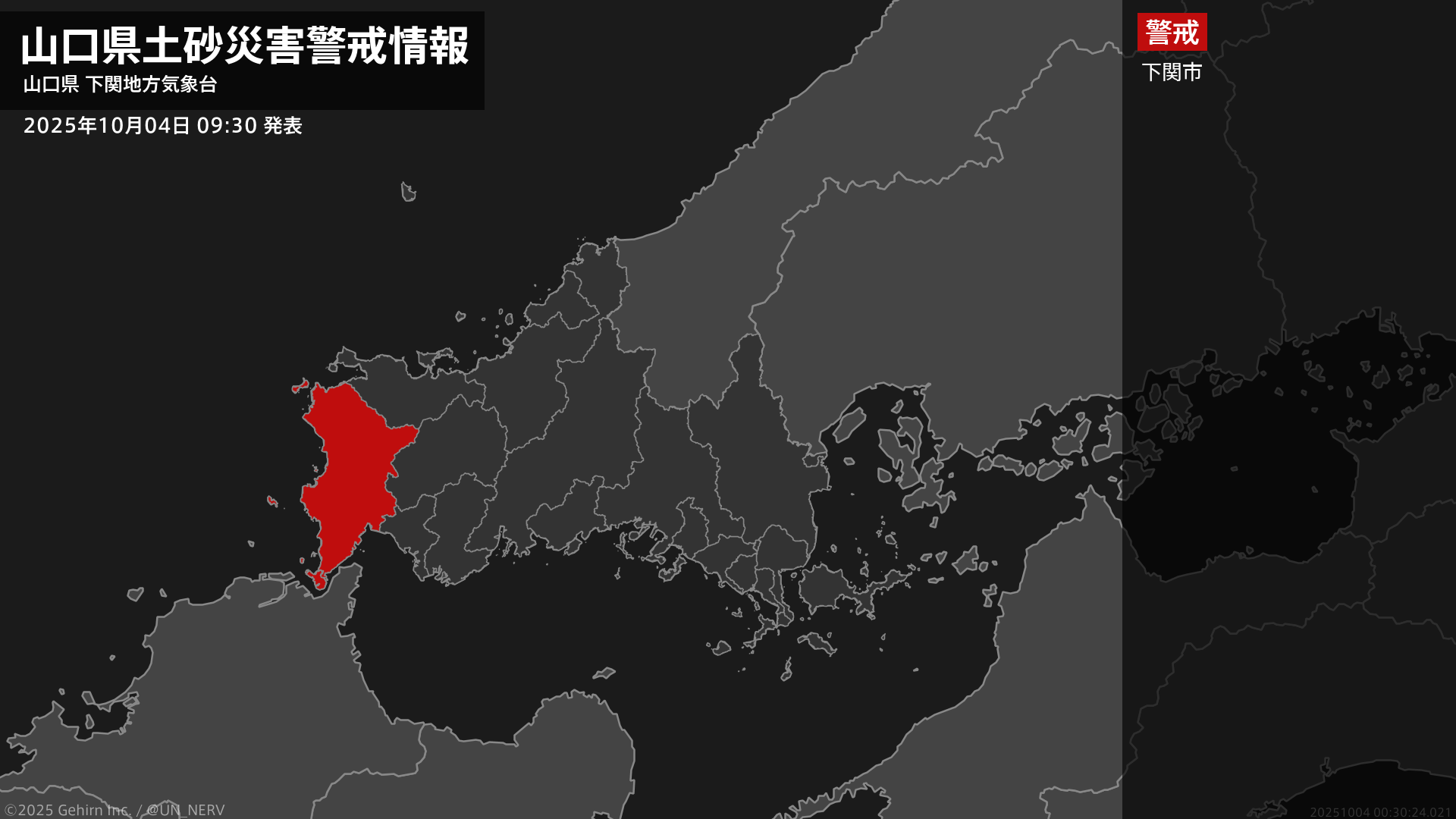 【山口県 土砂災害警戒情報 2025年10月04日 09:30】山口県の警戒対象地域では土砂災害の危険度が高まっています。身の安全を確保するよう努めてください。#土砂災害警戒情報 #山口県