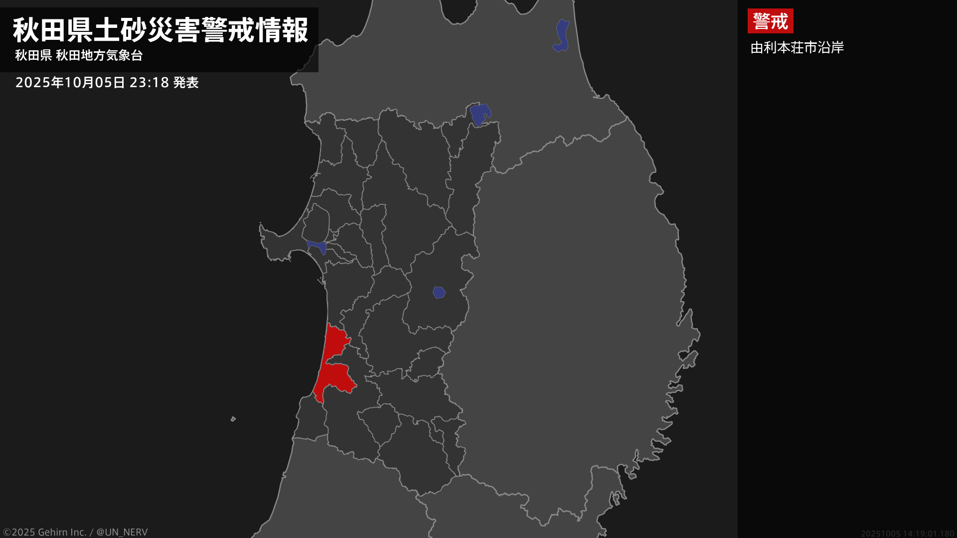 【秋田県 土砂災害警戒情報 2025年10月05日 23:19】秋田県の警戒対象地域では土砂災害の危険度が高まっています。身の安全を確保するよう努めてください。#土砂災害警戒情報 #秋田県