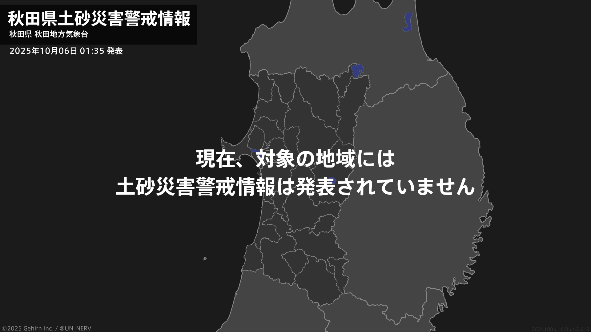 【秋田県 土砂災害警戒情報 2025年10月06日 01:35】秋田県に発表されていた土砂災害警戒情報はすべて解除されました。#土砂災害警戒情報 #秋田県
