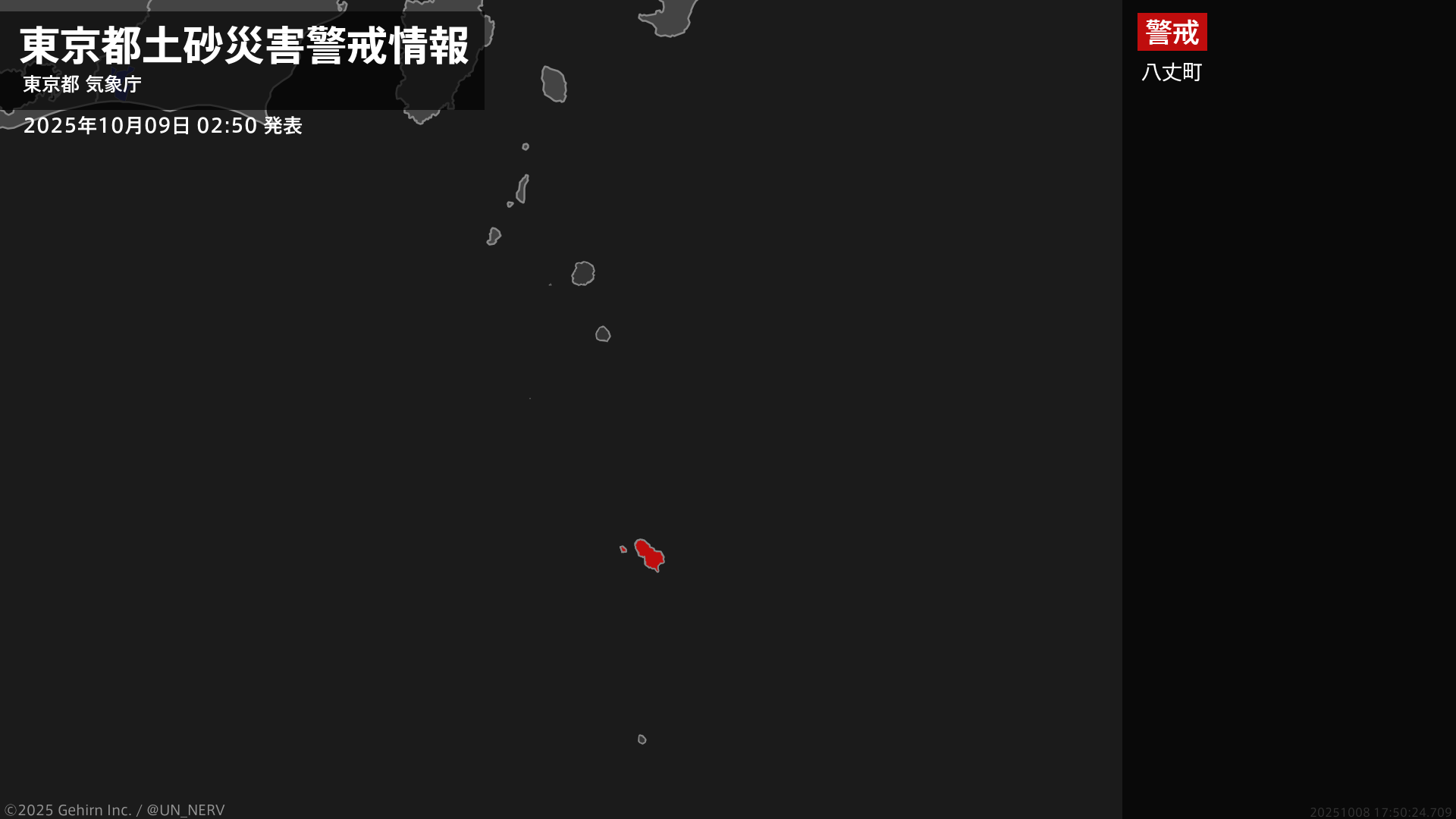 【東京都 土砂災害警戒情報 2025年10月09日 02:50】東京都の警戒対象地域では土砂災害の危険度が高まっています。身の安全を確保するよう努めてください。#土砂災害警戒情報 #東京都