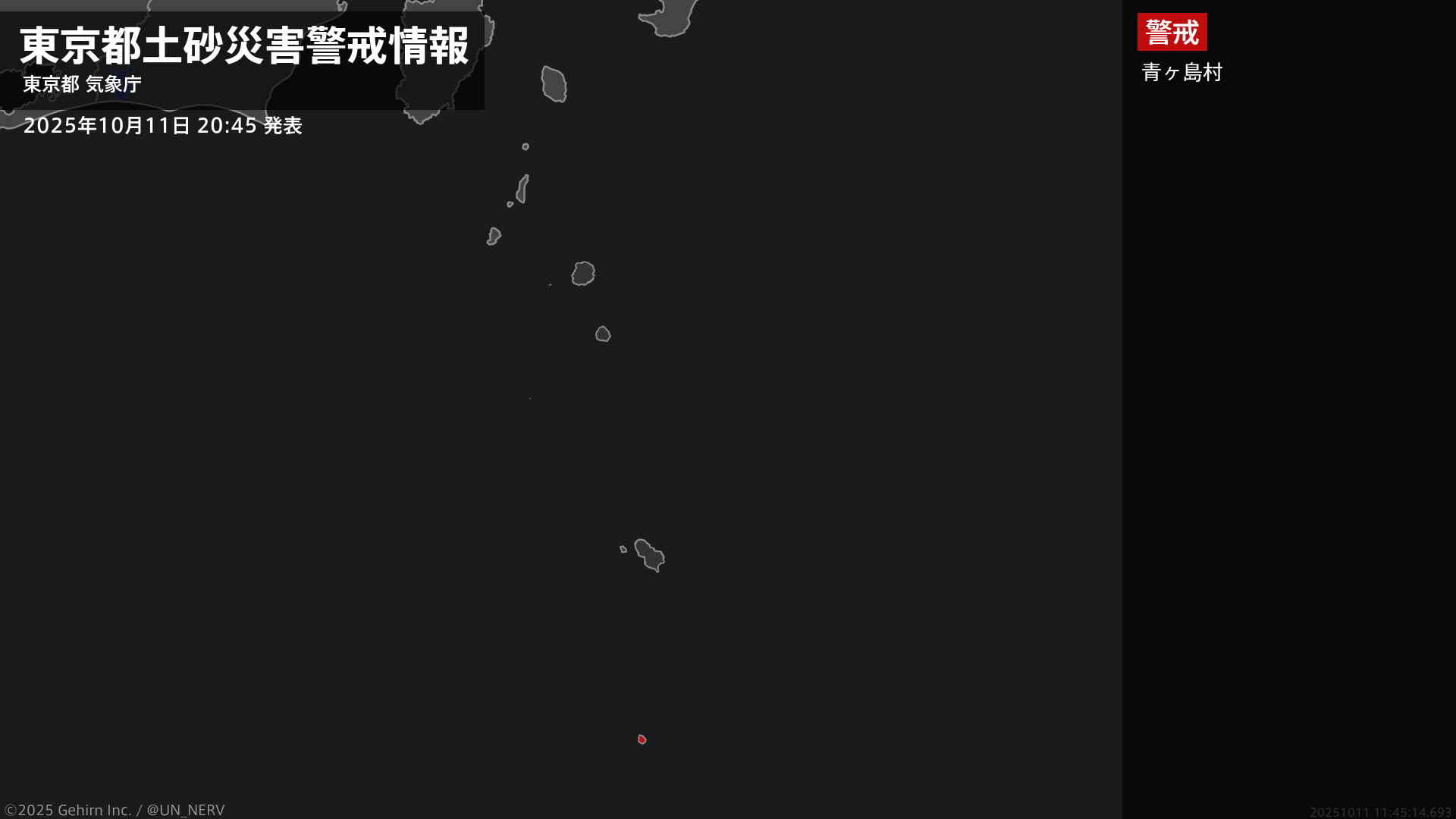 【東京都 土砂災害警戒情報 2025年10月11日 20:45】東京都の警戒対象地域では土砂災害の危険度が高まっています。身の安全を確保するよう努めてください。#土砂災害警戒情報 #東京都